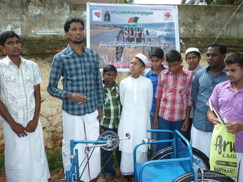 Social Democratic Party Of India SDPI Donated a Hand Cycle to Mr. Sirajudheen, Thengapattanam. Cycle was Handed over by Jamaath Peoples and Conveiner after Eid Prayer, infron tof valiyapalli. SDPI Fund Collection for Assam Peoples