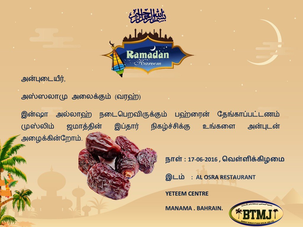 BTMJ Ifthar Invitation. Gathering on Friday 17th June, 2016 at Al Osra Resturant, 2nd floor, Manama Yeateem Center.